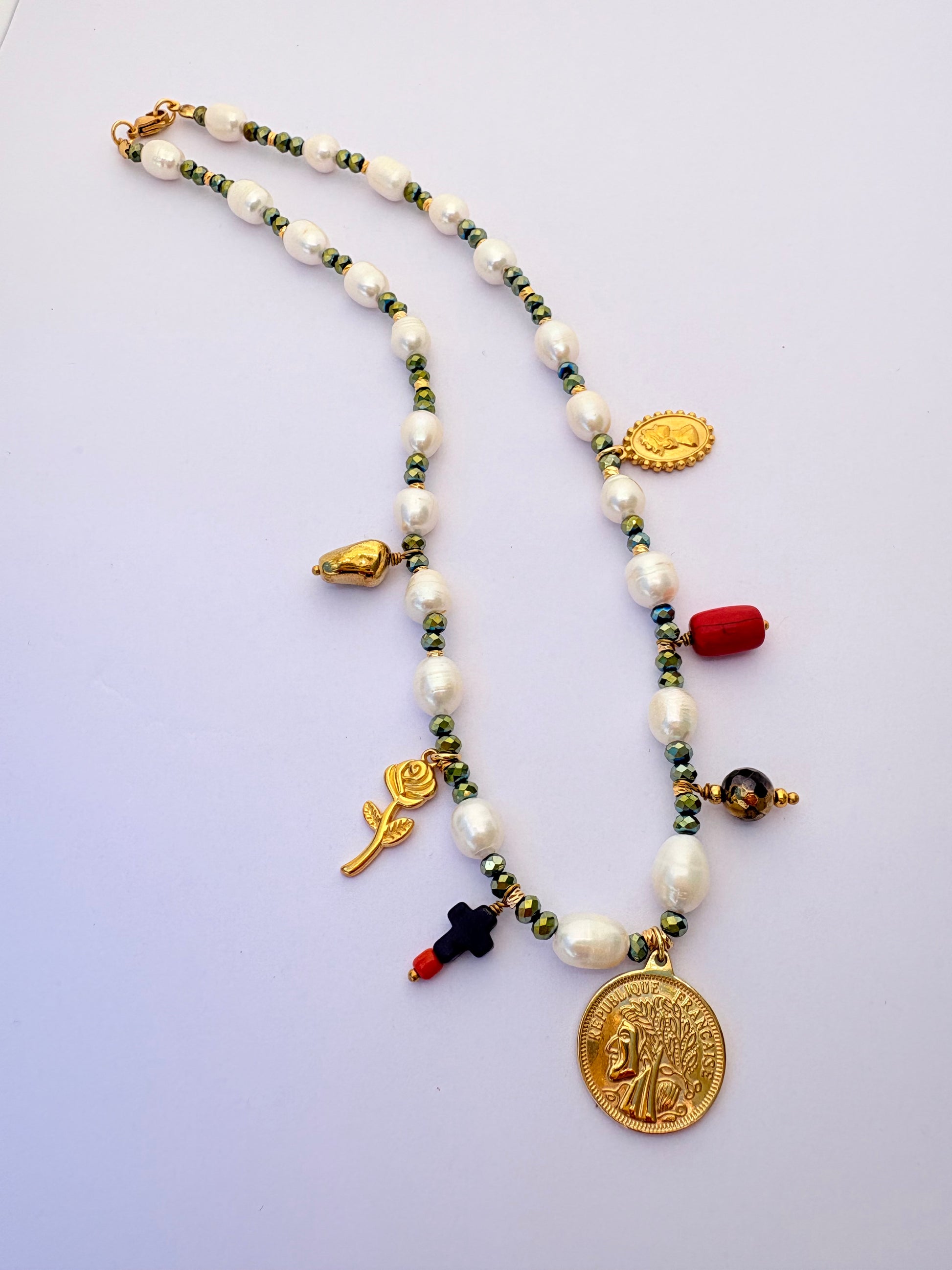Camino Firme es una pieza confeccionada con perlas barrocas, símbolo de la belleza que surge en cada proceso. Los dijes religiosos evocan guía divina, mientras que los cristales tornasol representan los momentos que nos han marcado. Sus colgantes en acero inoxidable —flor, reina y moneda— aportan fuerza y significado. Largo: 18".