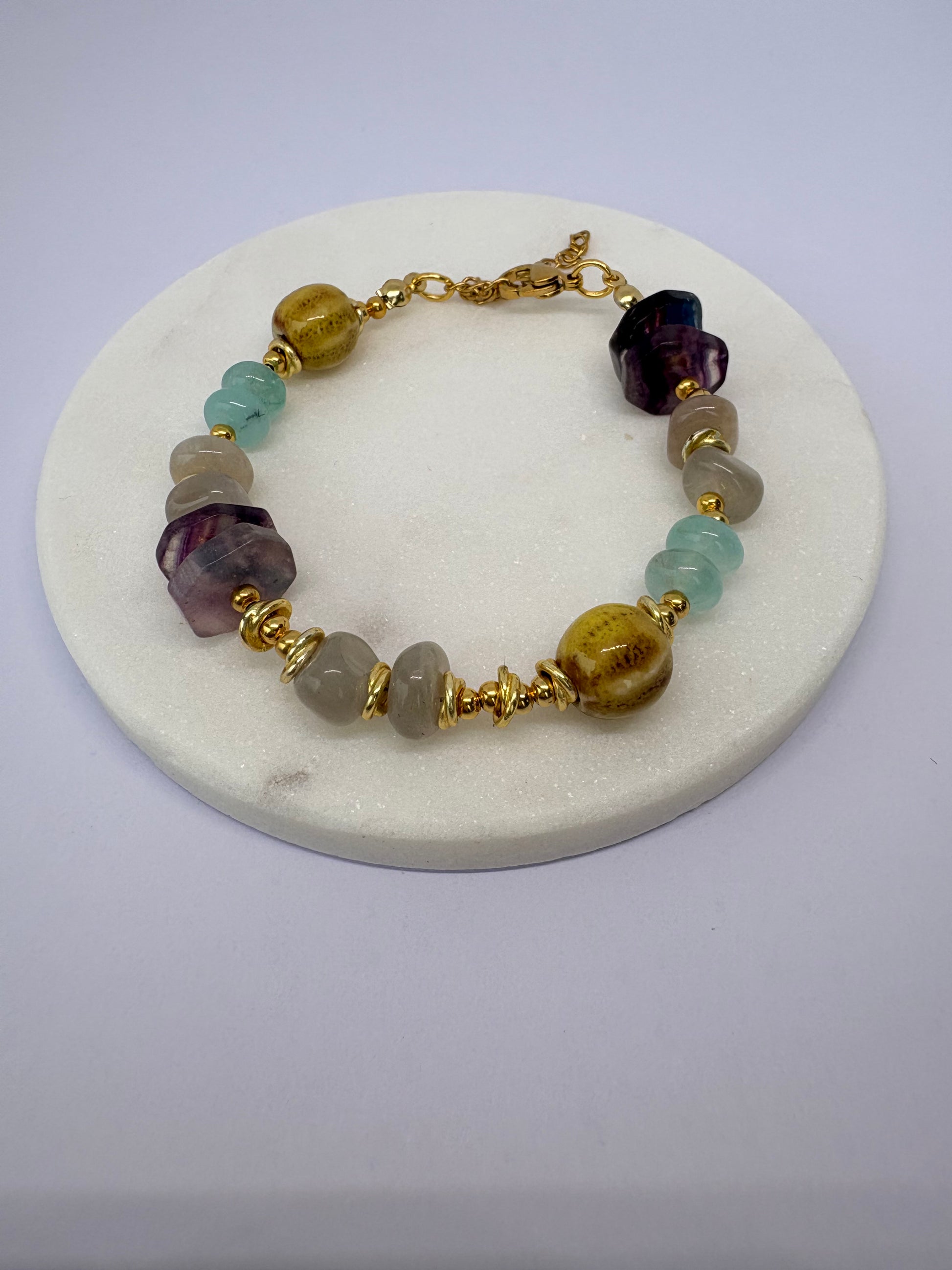 Inspirado en los colores cálidos del atardecer. Nos recuerda que el cierre de un día nos trae belleza, calma y esperanza de un nuevo comenzó. Confeccionada con piedras semipreciosas y cerámica. Largo: 7” y extensión de 2”.