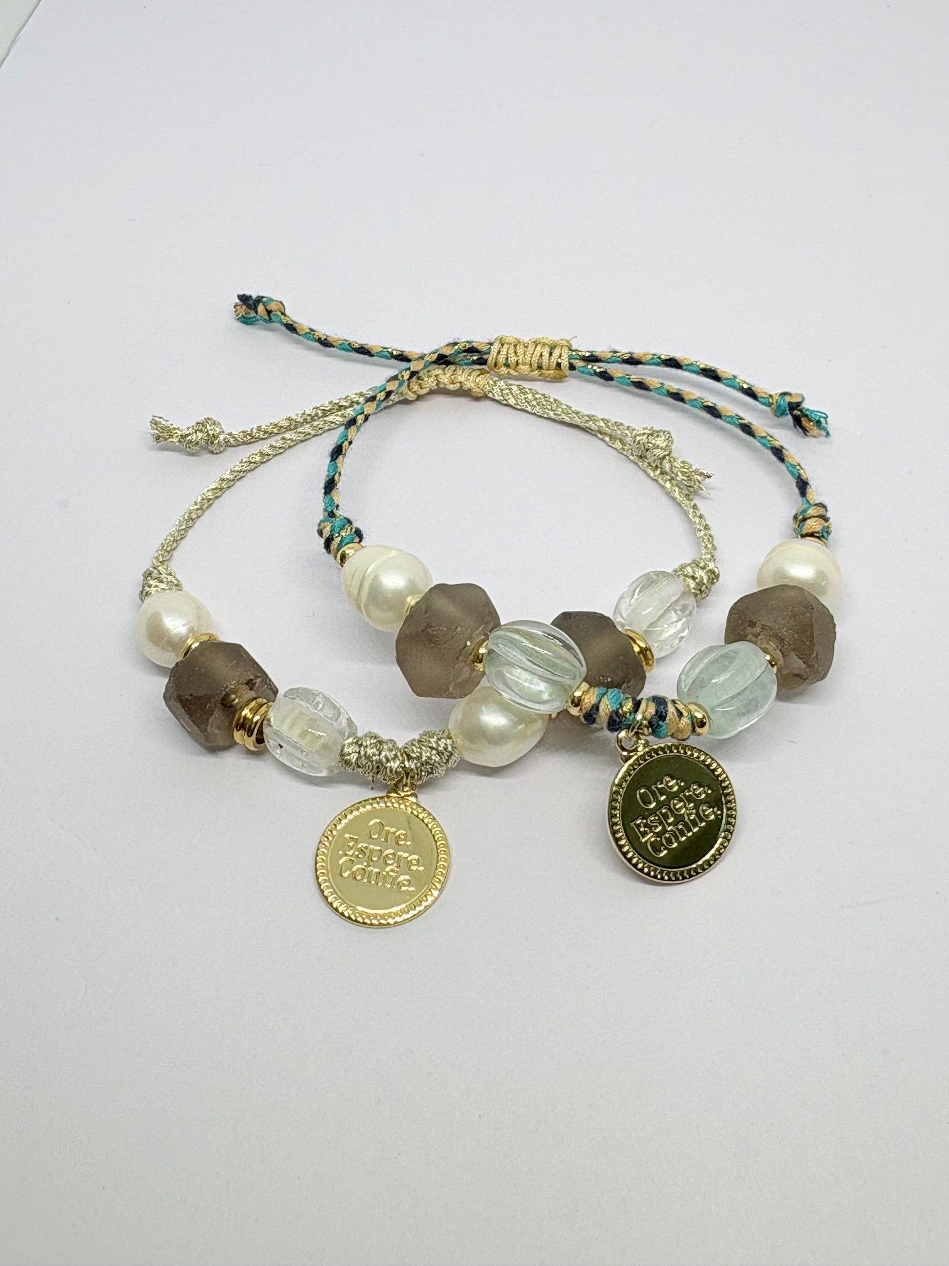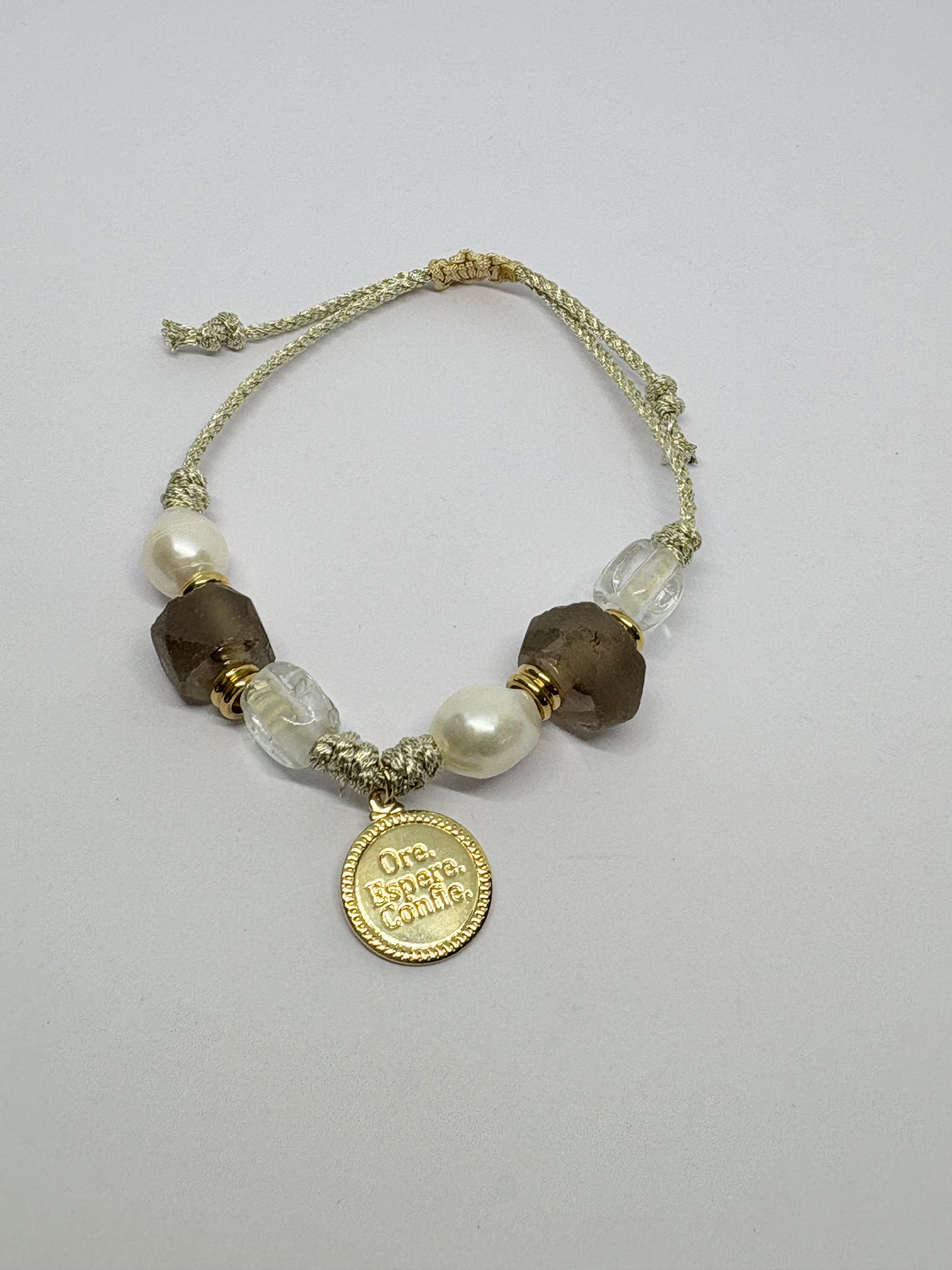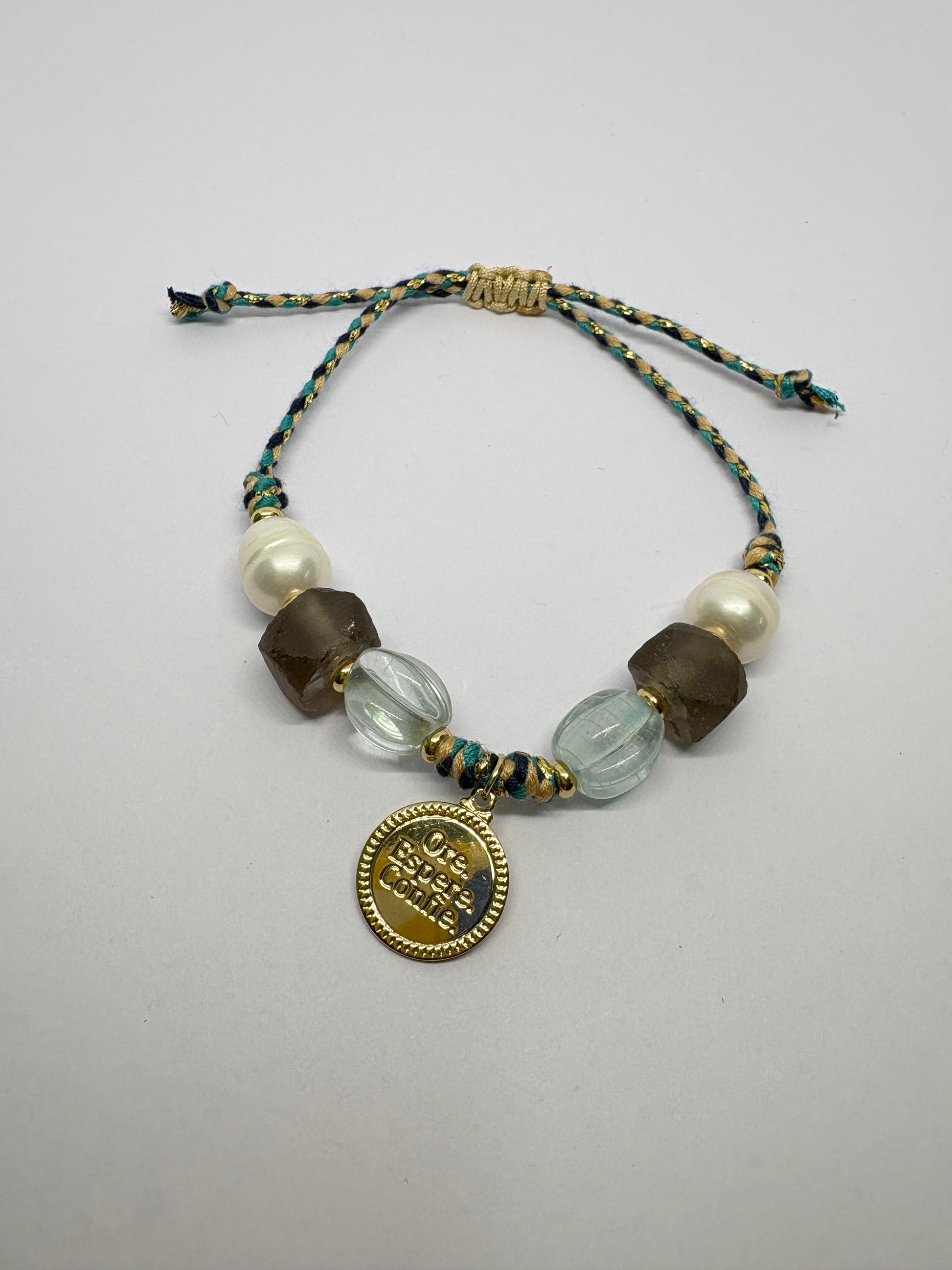 Esta pulsera te invita a orar, esperar y confiar. El tiempo de Dios es perfecto, solo deja que Él obre. Es tejida en hilo con perlas naturales, cristales y colgante chapado en oro 18k. Ajustable