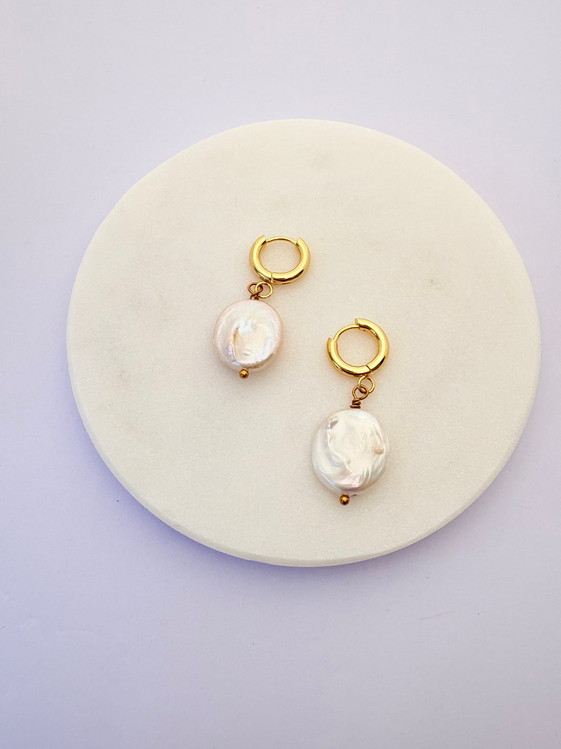 Pantallas Perla Preciosa, elaboradas con perlas barrocas naturales y cierre en acero inoxidable bañado en oro 18k. Un diseño clásico y sofisticado que resalta la elegancia en cada detalle.