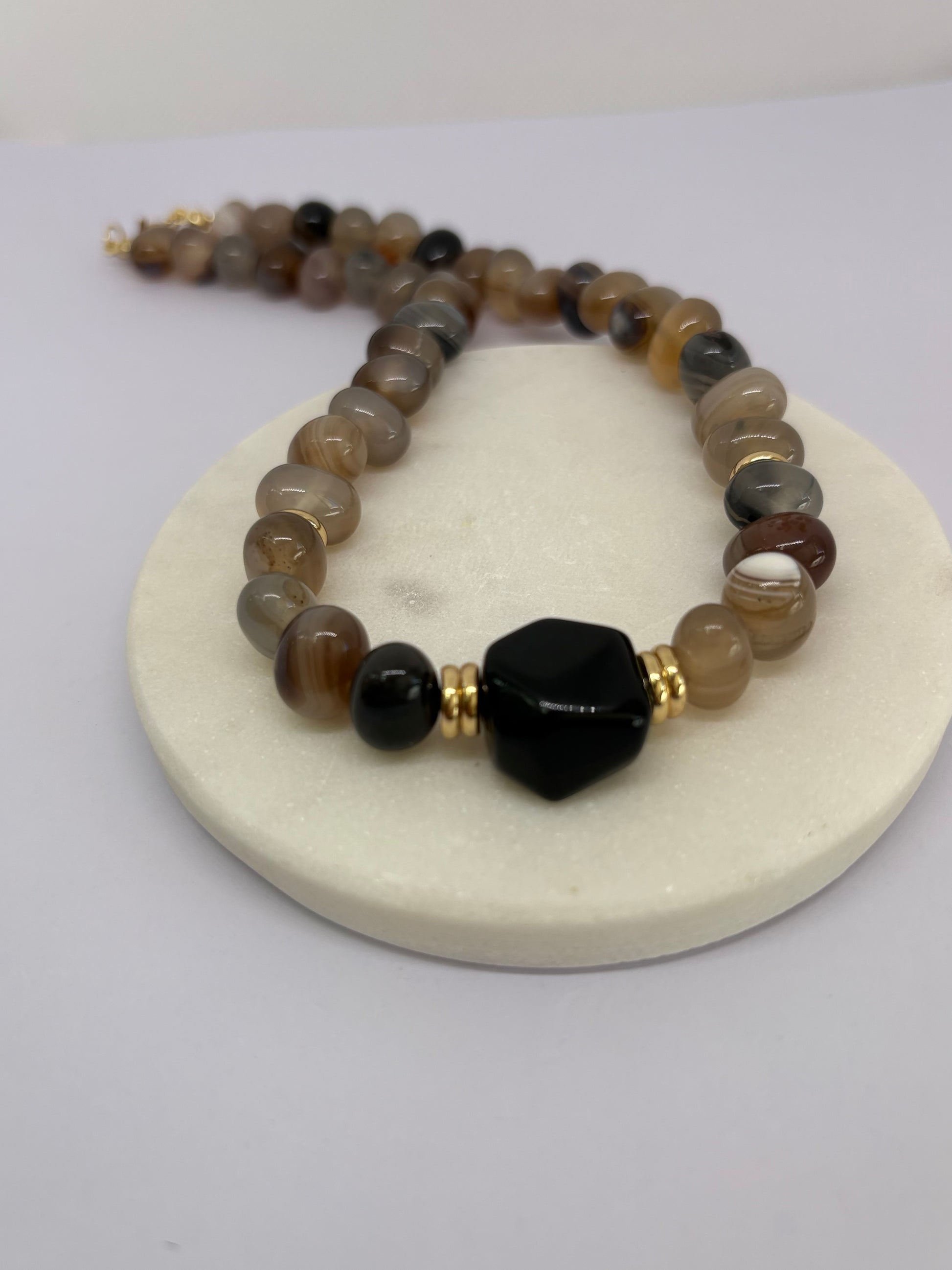 Roca firme es símbolo de lugar seguro, donde la fe nos sostiene y el alma descansa. Collar confeccionado con Agatas naturales. Largo: 16" 1/2 con extensión de 2".