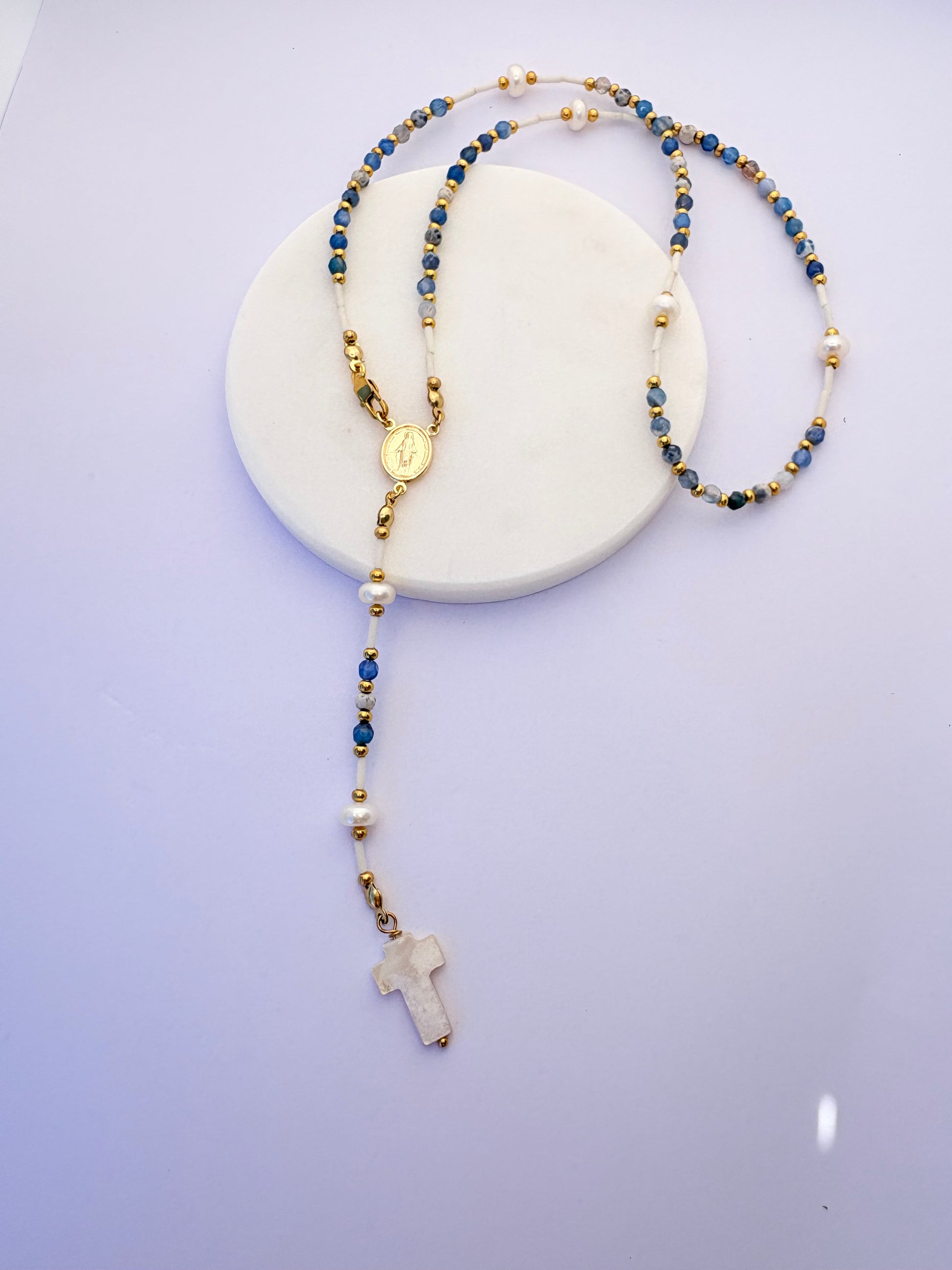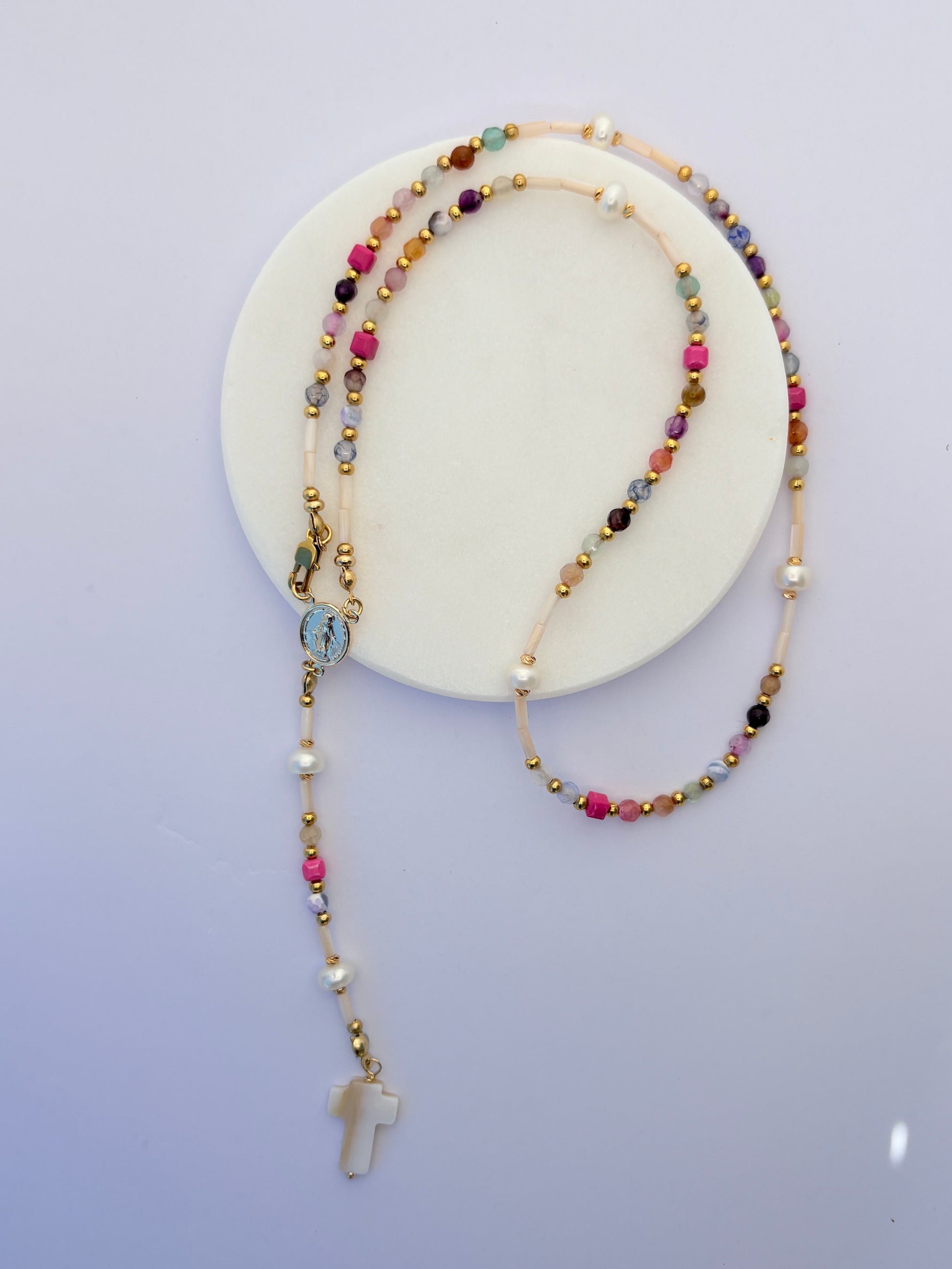 El rosario esta confeccionado con agatas y perlas naturales. Cuenta con cierre en el centro del rosario.